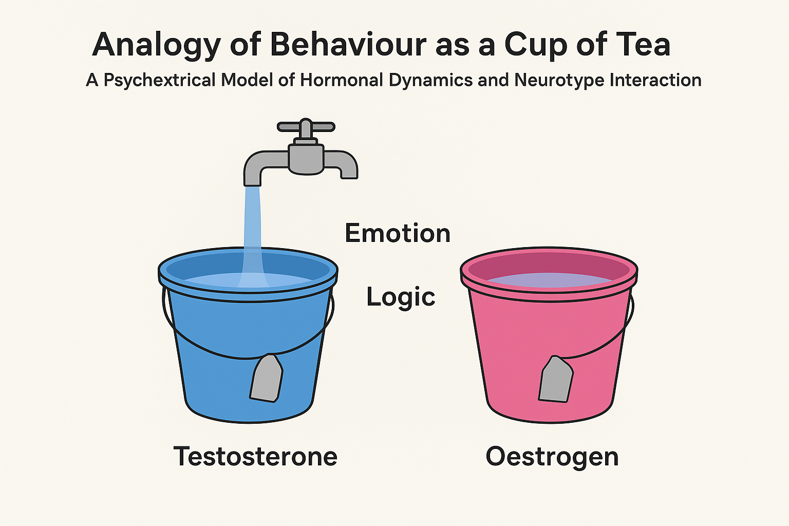 Behaviour, as Psychextrics shows, is not brewed from gender but from timing, density, and emotional activation. The cup of tea analogy reveals that all humans share the same ingredients—logic and emotion—but differ in how their hormonal buckets let those ingredients steep and flow.