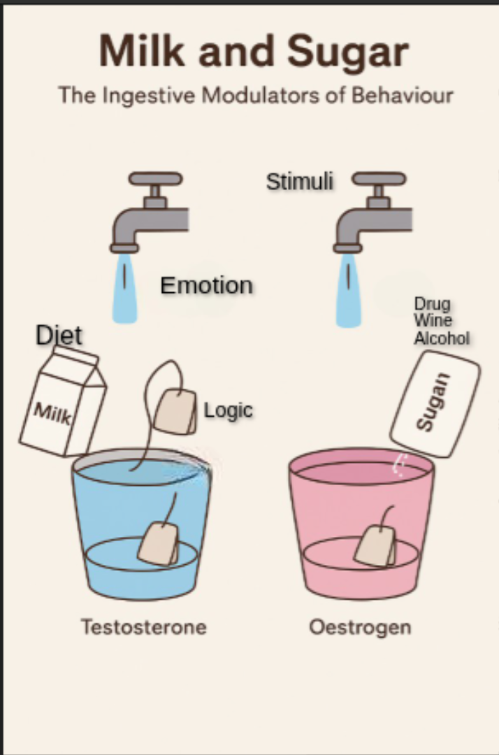 Of course, most people would not like the idea of drinking a blank tea that lacks taste or vitality. This is where milk and sugar enter the analogy—not as mere additives of flavour, but as representations of external influences that shape, modify, or distort behavioural outputs. In the psychextrical model, milk symbolises dietary influences, while sugar represents the stimulatory effects of drugs, wine and alcohol on the hormonal–neural circuitry.